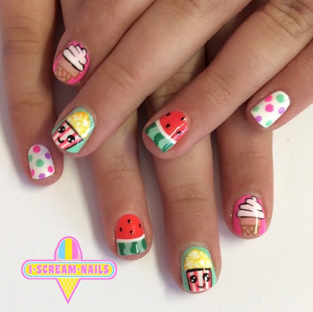Recently via instagram I found I Scream Nails located in Australia (Melbourne and Sydney) and fell in love so hard. I adore bright, bold, colorful, and unique designs. I also am fascinated with things that involve pop culture icons or trends whether it be Hello Kitty, Aliens, Pizza, Watermelon, etc.